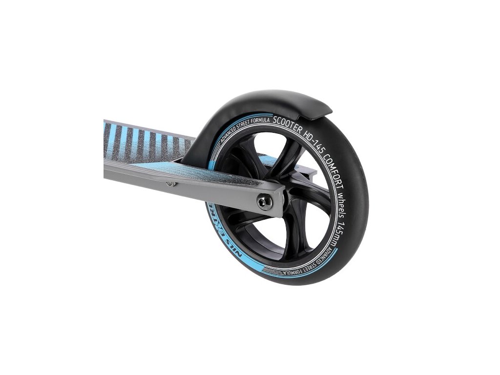 Riadidlá majú šírku 46 centimetrov a rukoväte sú opatrené gumovými gripy, táto kombinácia zaručuje pohodlný úchyt a istotu v konaní aj pri vysokých rýchlostiach, ktorých HD145 dosahuje vďaka polyuretánovým kolieskam s priemerom 145 mm a ložiskám ABEC 5. Kolieska sú opatrené blatníky, ktoré Vás udrží v čistote aj v prípade, že potrebujete prejsť kaluží, alebo Vás zastihne napríklad dažďová prehánka. Zadný blatník zároveň slúži ako nožná brzda, tá umožňuje rýchle zastavenie a tým zvyšuje bezpečnosť kolobežky.
