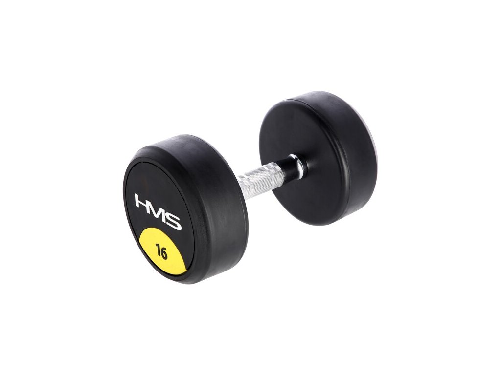 16 kilogramová jednoručná činka HMS HG Pro je určená pre profesionálne použitie ako doma tak v posilňovni. Závažie tvorí liatinový odliatok pokrytý hrubou vrstvou gumy, ktorá ochráni ako činku, tak podklad pred poškodením. Na čelnej strane je značka HMS a údaj o hmotnosti v kilogramoch. Rukoväť je vyrobená z chrómovanej ocele, pre pohodlný úchop má súdkovitý tvar s vrúbkovaným povrchom.